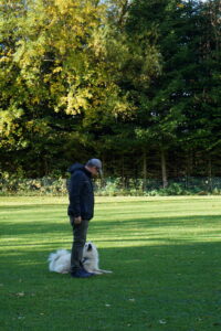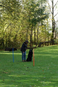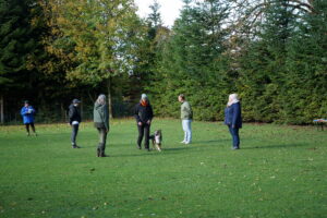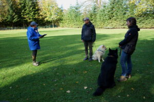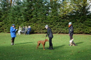 Weiter ging es mit der Chipkontrolle, Ablage auf Entfernung, Fuß laufen schnell und langsam und einem Fuß-Lauf durch eine Menschengruppe. Damit war der zweite Teil der Prüfung erledigt.