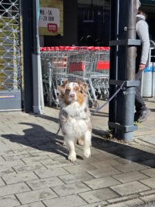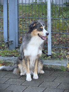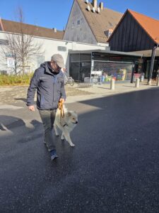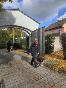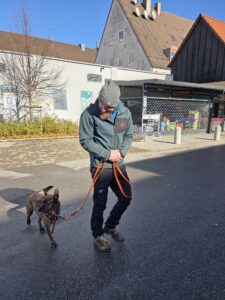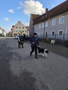 Nun nahmen alle Bestehenden des vorherigen Bereiches den Verkehrsteil in Angriff für den wir gesammelt nach Türkheim fuhren. Hier mussten Hund und Mensch ihr einwandfreies Verhalten unter verschiedenen Bedingungen unter Beweis stellen. Dazu gehörten das Anbinden während die Frauchen und Herrchen außer Sicht sind und das gelassene passieren von Autos und Motorrädern. Auch Passanten durften nicht angebellt werden. Aber diesen letzten Teil haben alle mit Bravour gemeistert 🙂