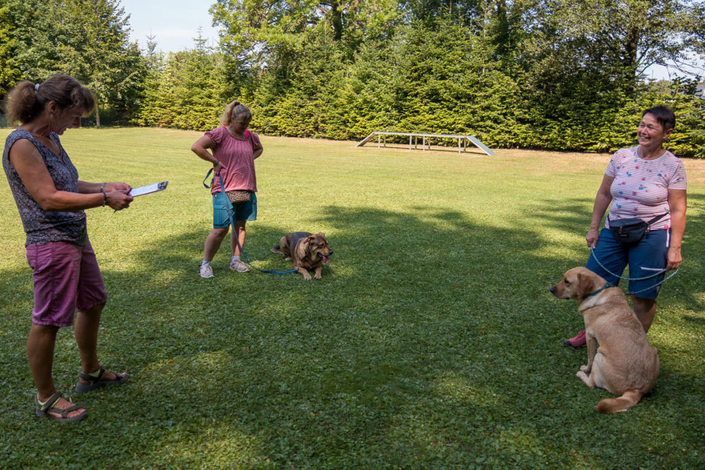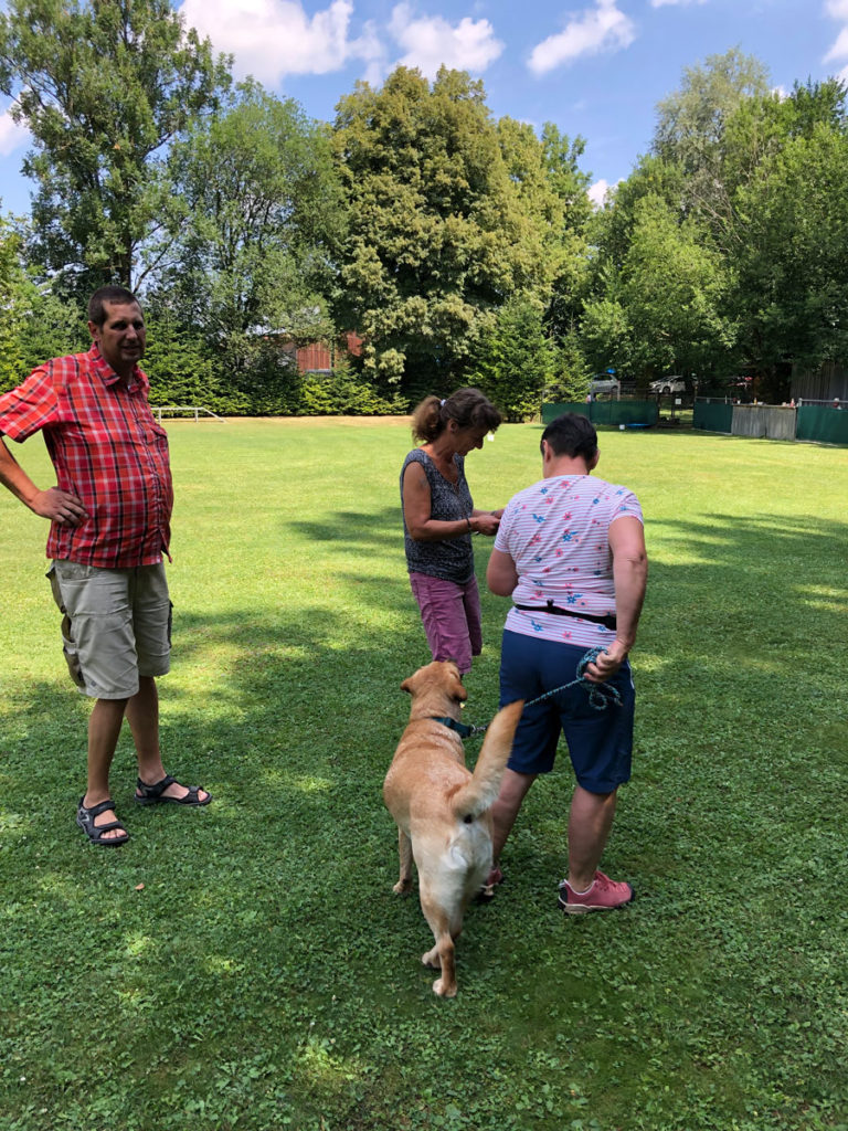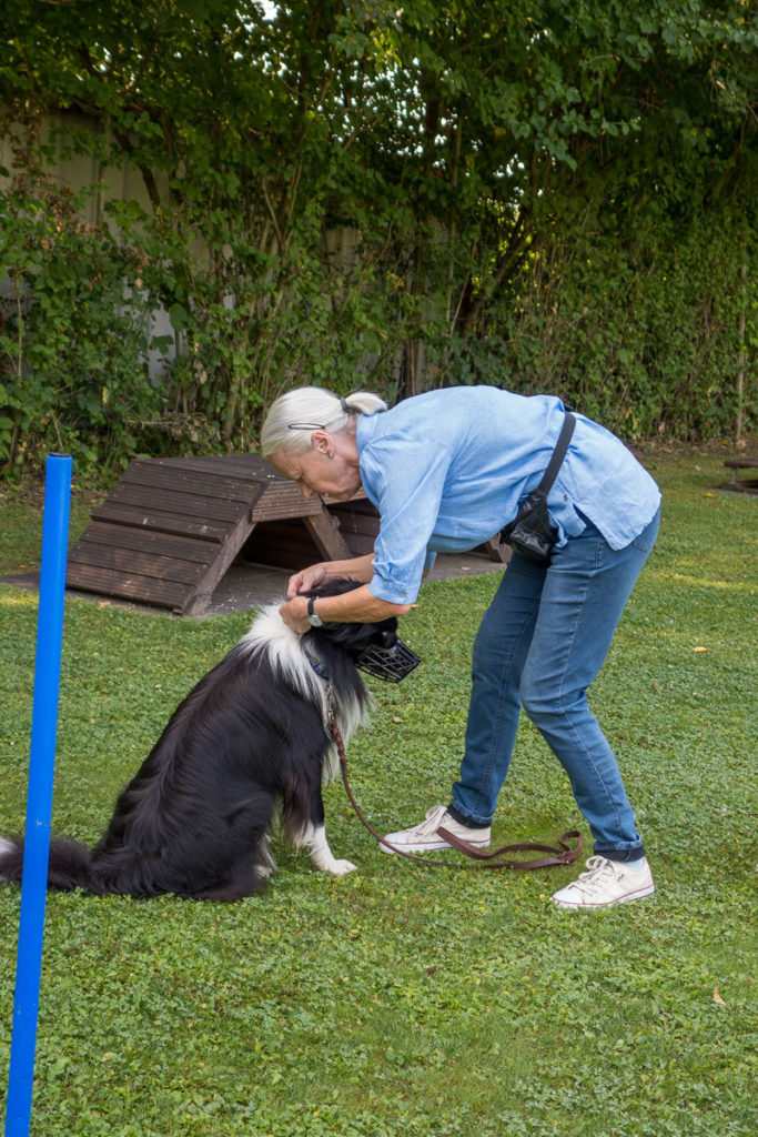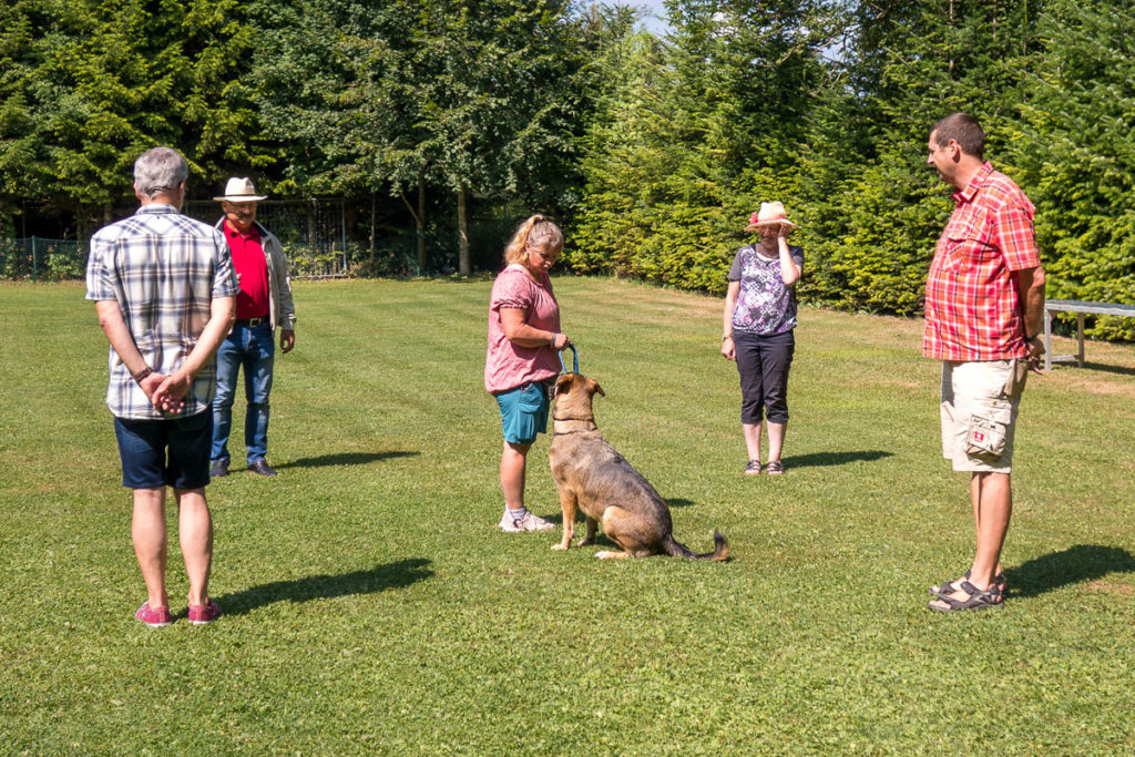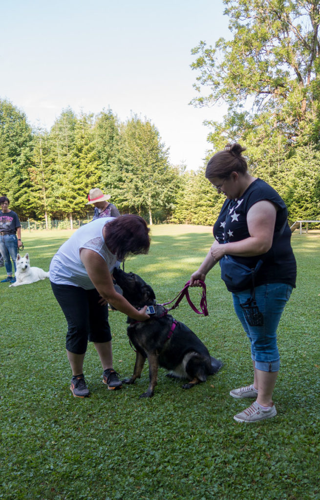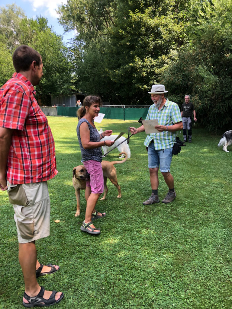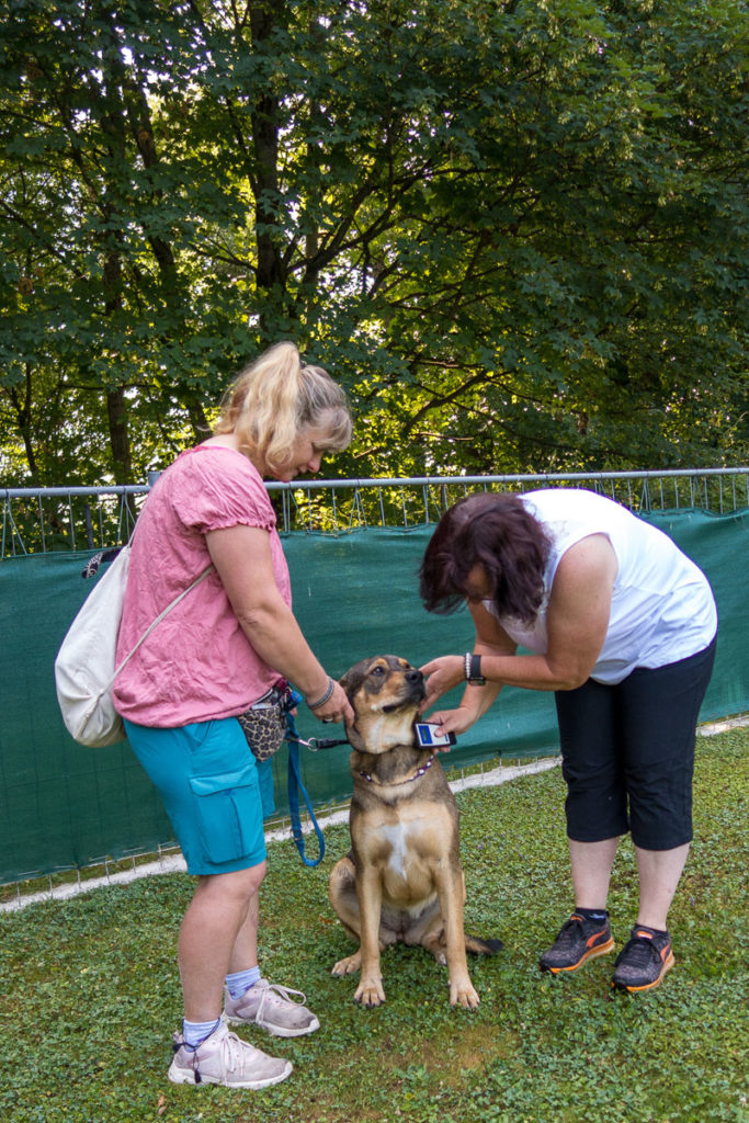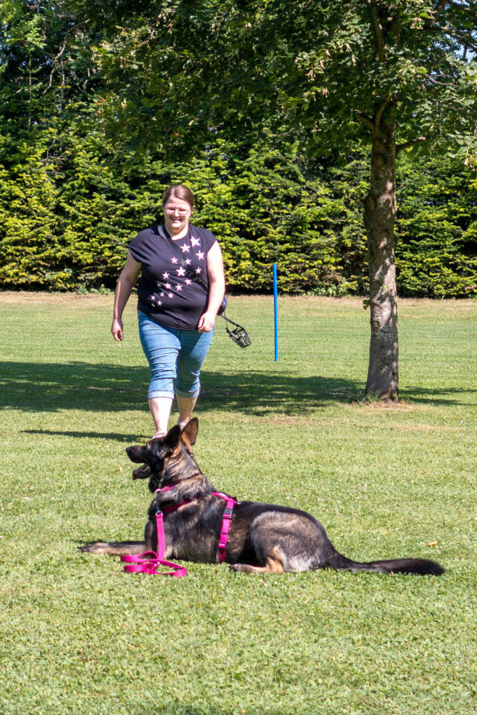 Punkt 9:30 Uhr gings dann auch schon los. Immer zwei Teams wurden auf den Platz gebeten und haben von der Trainerin Gitti die Anweisungen erhalten, die ausgeführt werden mussten. Von einem zuverlässigen Sitz und Platz inkl. Distanz zum Hundehalter, laufen an lockerer Leine, dem Anlegen eines Maulkorbs, auslesen des Chips, dem Abruf unter Ablenkung, dem Lauf durch eine Gruppe von Menschen sowie der Königsdisziplin: dem Impuls zu widerstehen, das leckere Katzenfutter von einem der drei platzierten Teller zu naschen und sich auf den direkten Weg zu Frauchen bzw. Herrchen zu machen.