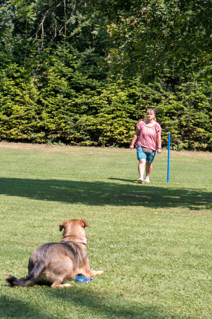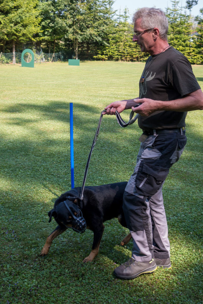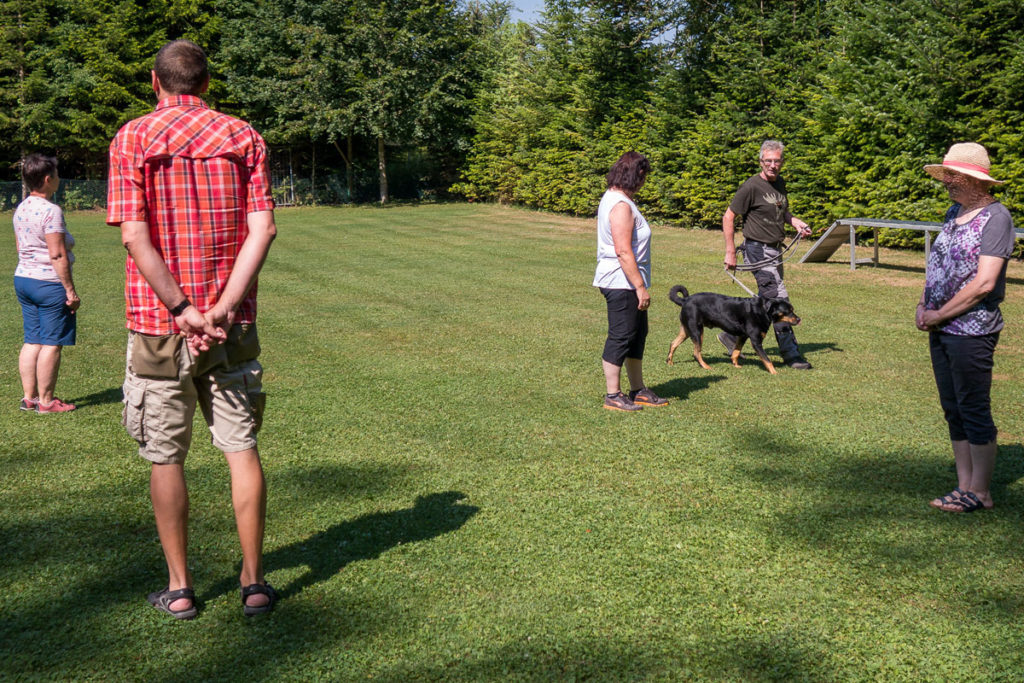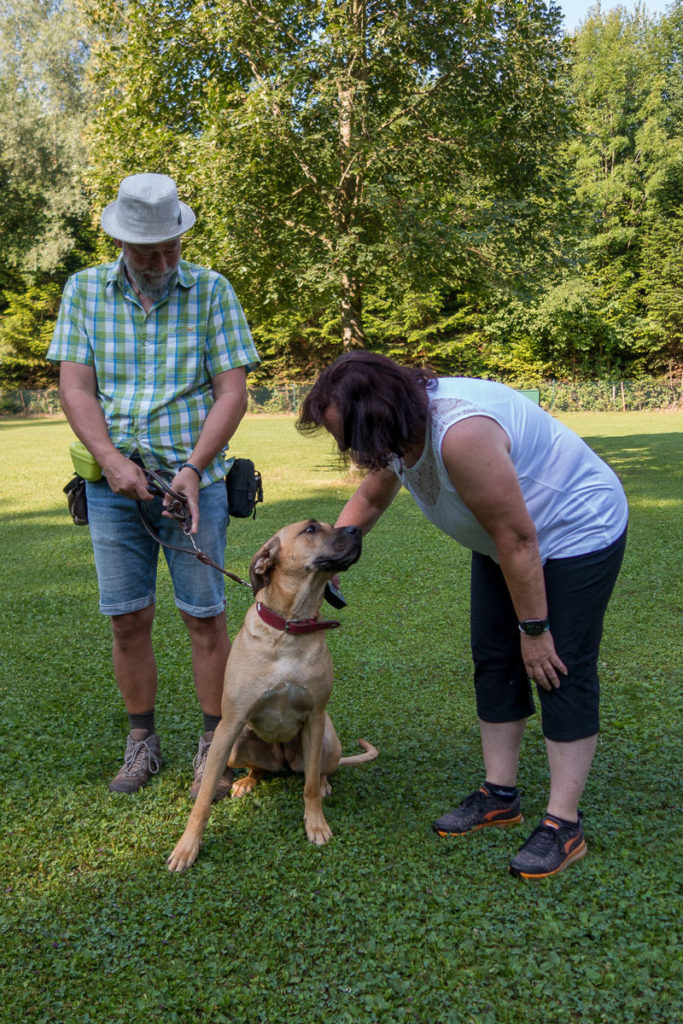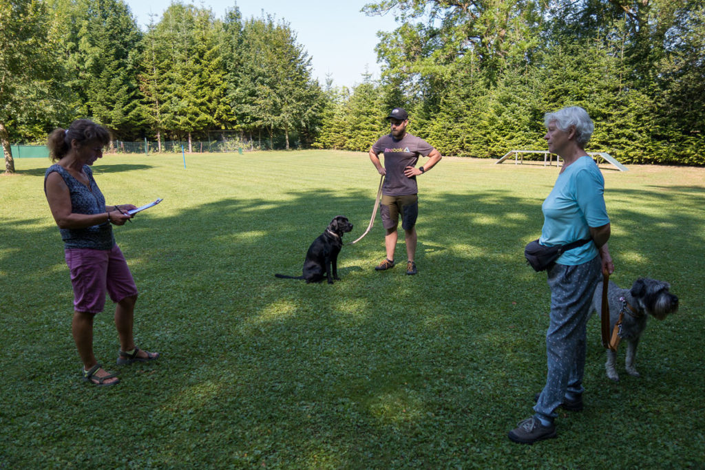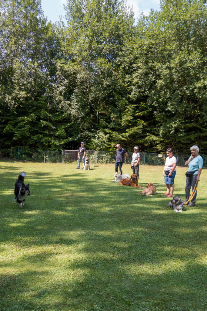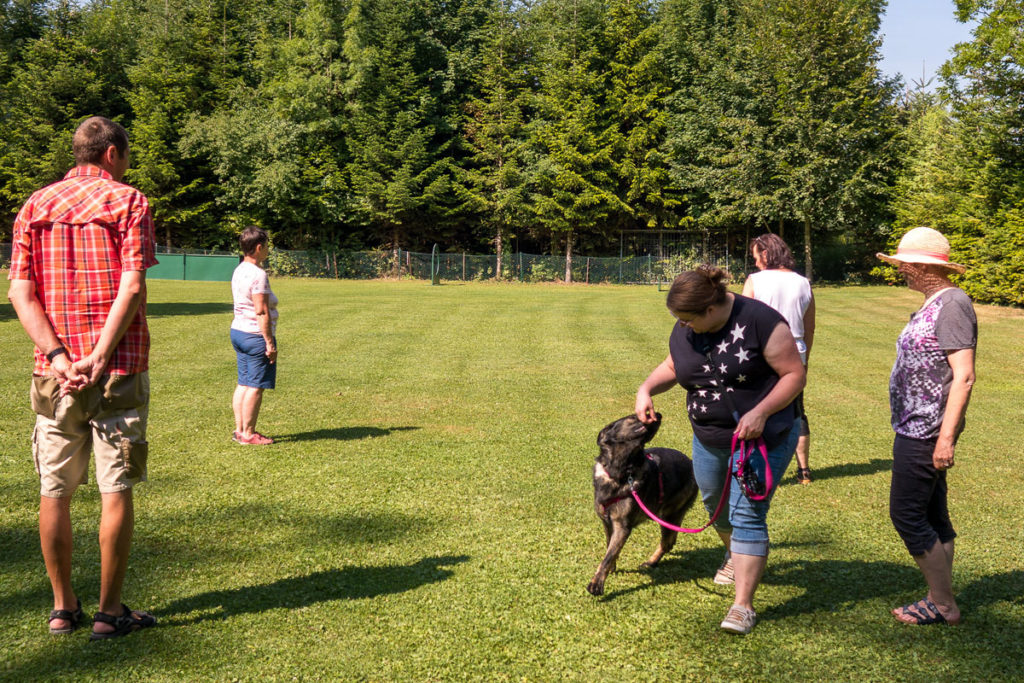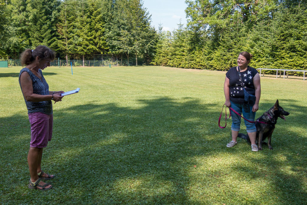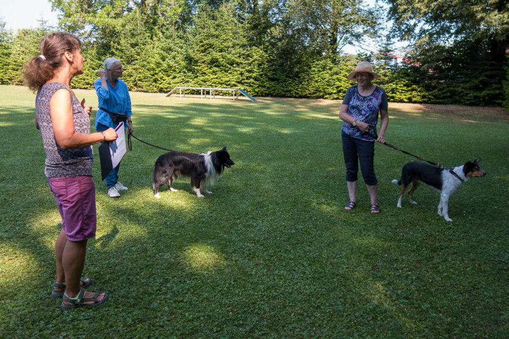 Punkt 9:30 Uhr gings dann auch schon los. Immer zwei Teams wurden auf den Platz gebeten und haben von der Trainerin Gitti die Anweisungen erhalten, die ausgeführt werden mussten. Von einem zuverlässigen Sitz und Platz inkl. Distanz zum Hundehalter, laufen an lockerer Leine, dem Anlegen eines Maulkorbs, auslesen des Chips, dem Abruf unter Ablenkung, dem Lauf durch eine Gruppe von Menschen sowie der Königsdisziplin: dem Impuls zu widerstehen, das leckere Katzenfutter von einem der drei platzierten Teller zu naschen und sich auf den direkten Weg zu Frauchen bzw. Herrchen zu machen.