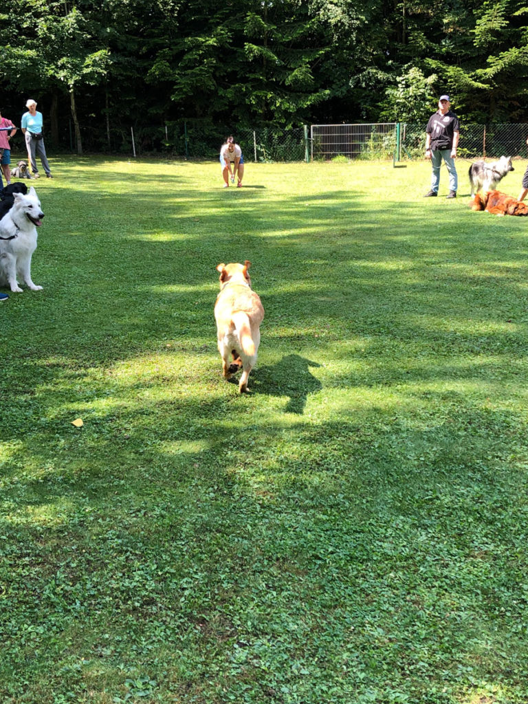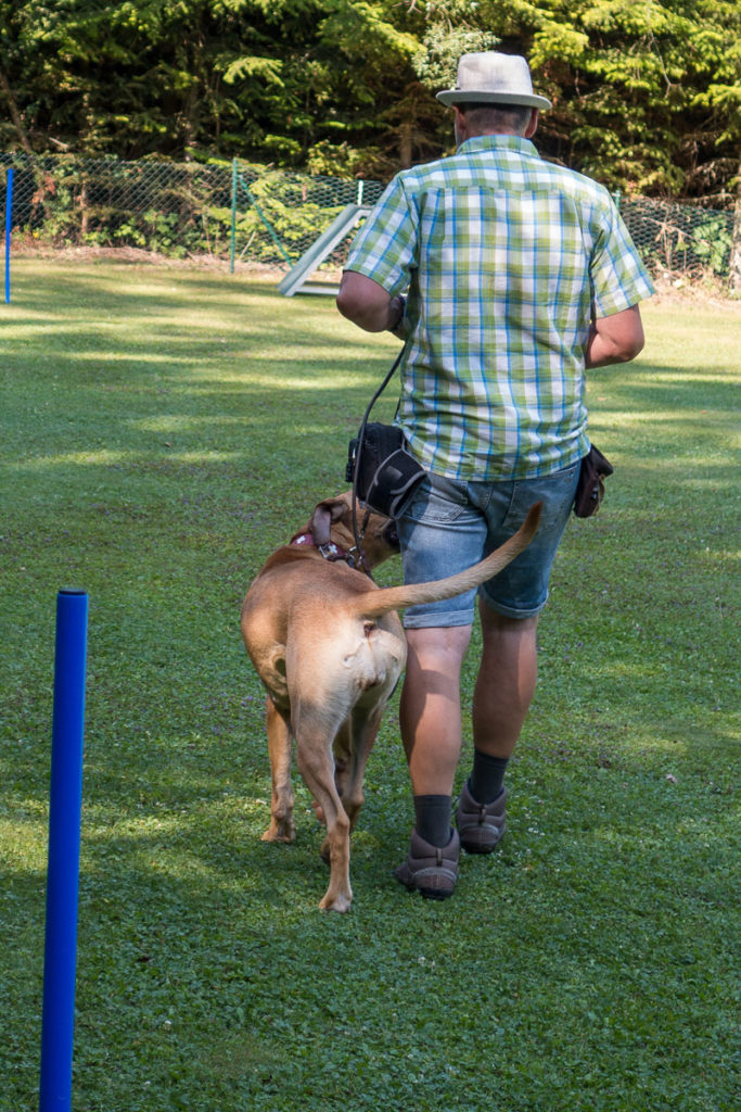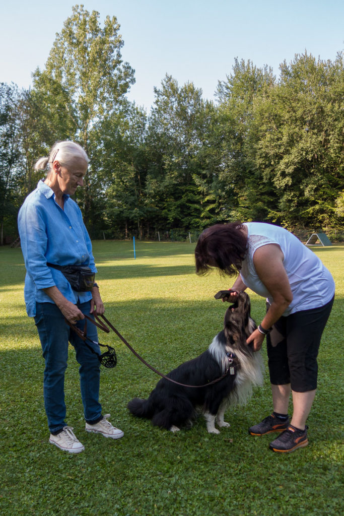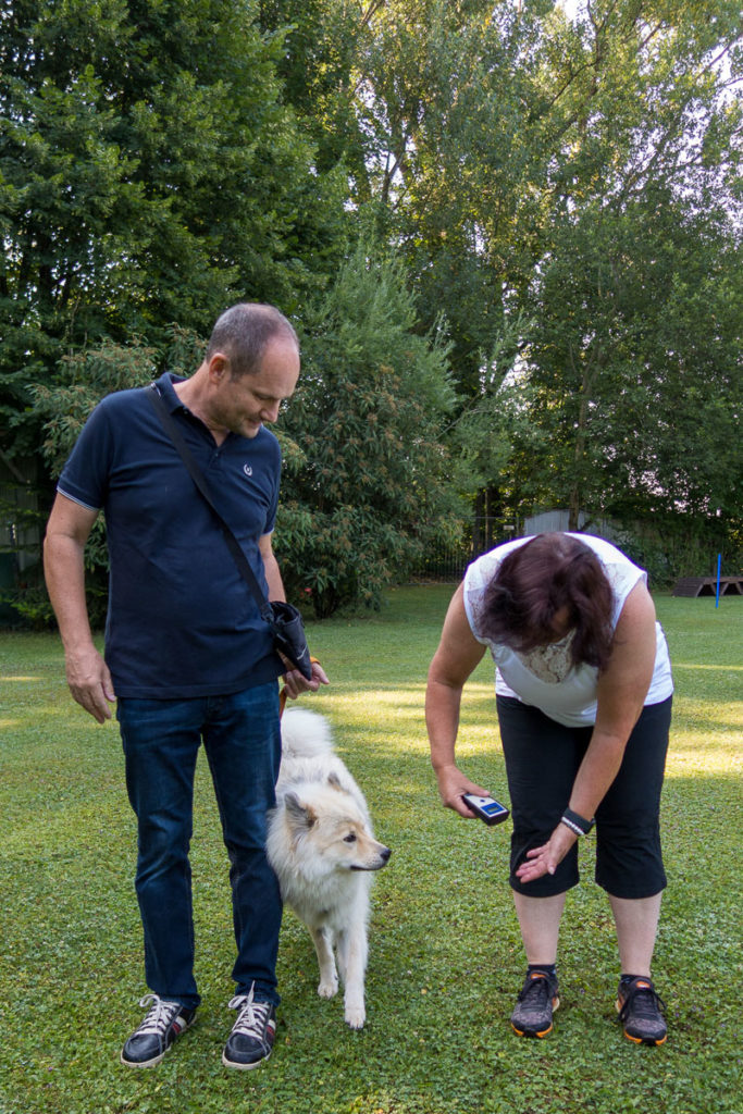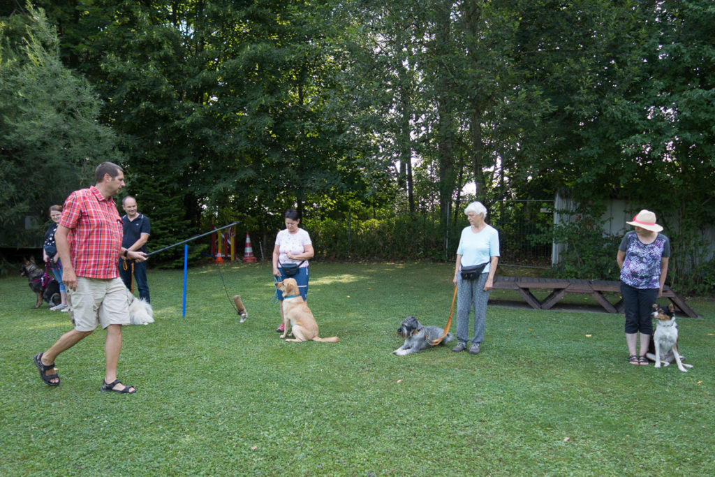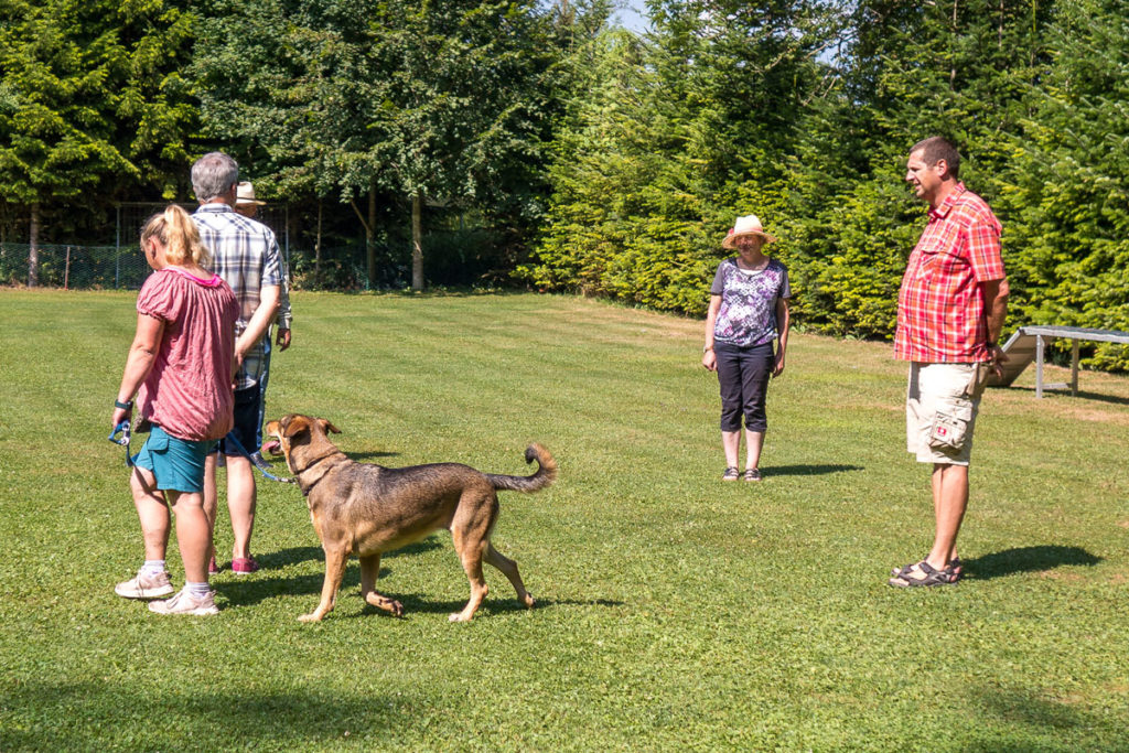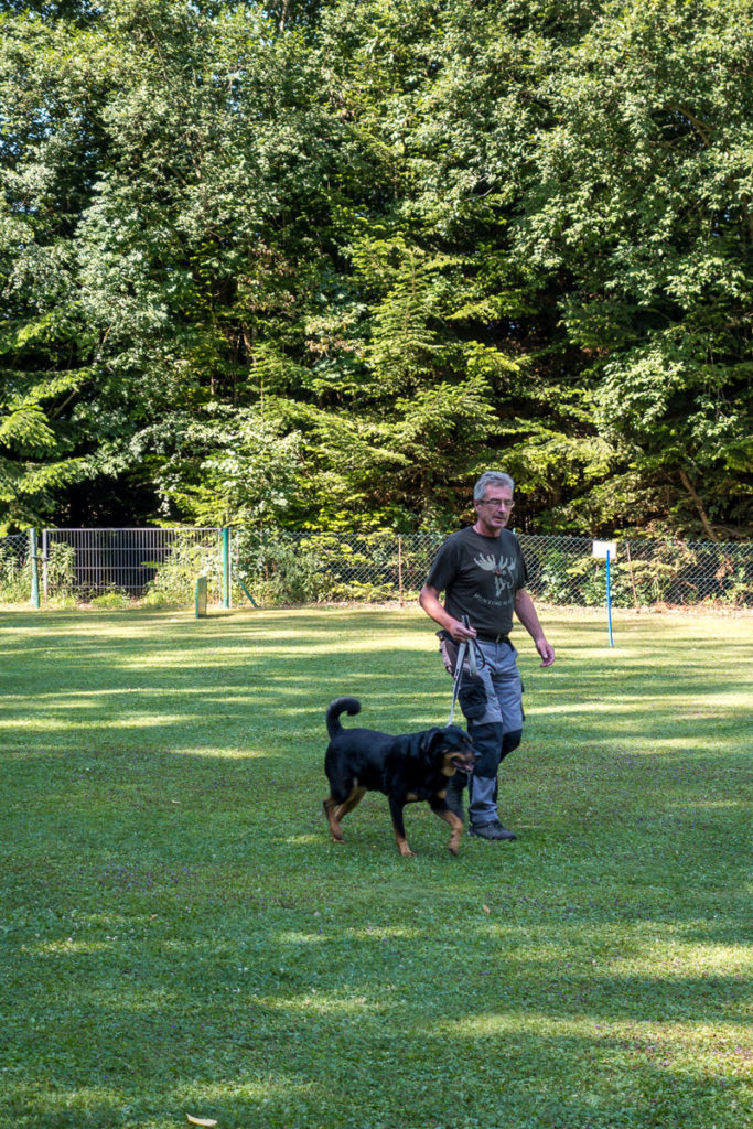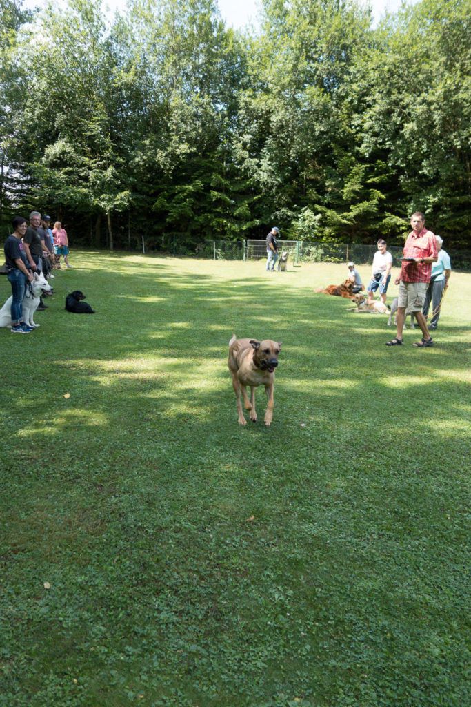 Punkt 9:30 Uhr gings dann auch schon los. Immer zwei Teams wurden auf den Platz gebeten und haben von der Trainerin Gitti die Anweisungen erhalten, die ausgeführt werden mussten. Von einem zuverlässigen Sitz und Platz inkl. Distanz zum Hundehalter, laufen an lockerer Leine, dem Anlegen eines Maulkorbs, auslesen des Chips, dem Abruf unter Ablenkung, dem Lauf durch eine Gruppe von Menschen sowie der Königsdisziplin: dem Impuls zu widerstehen, das leckere Katzenfutter von einem der drei platzierten Teller zu naschen und sich auf den direkten Weg zu Frauchen bzw. Herrchen zu machen.