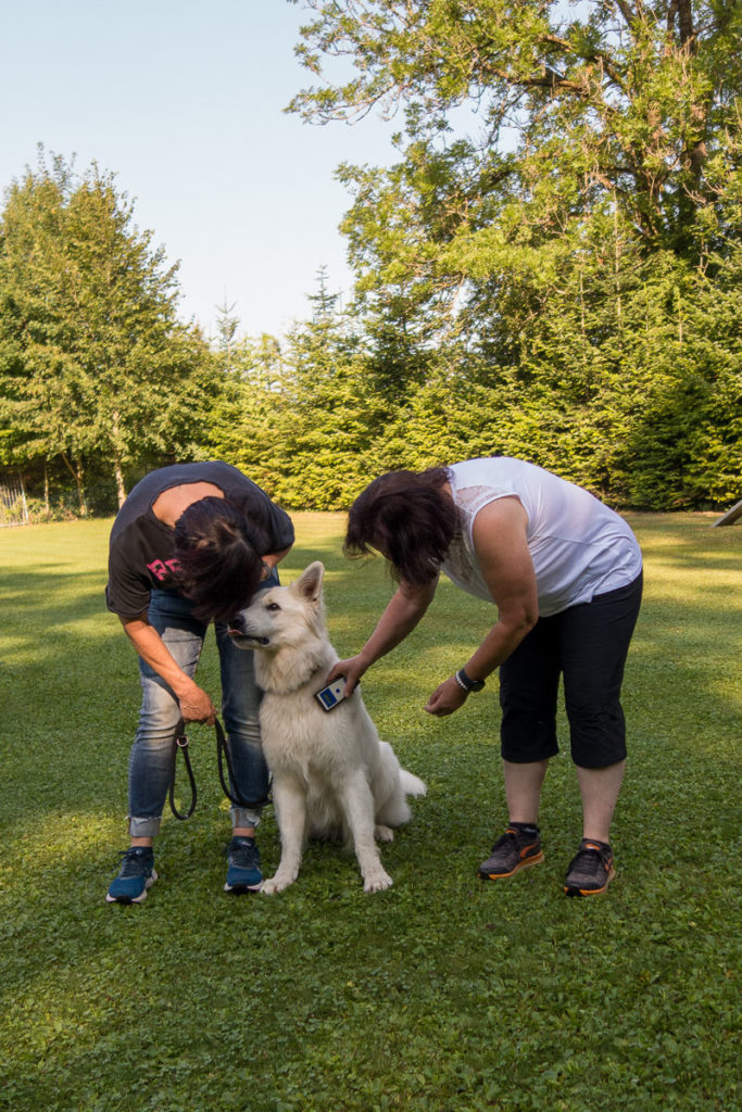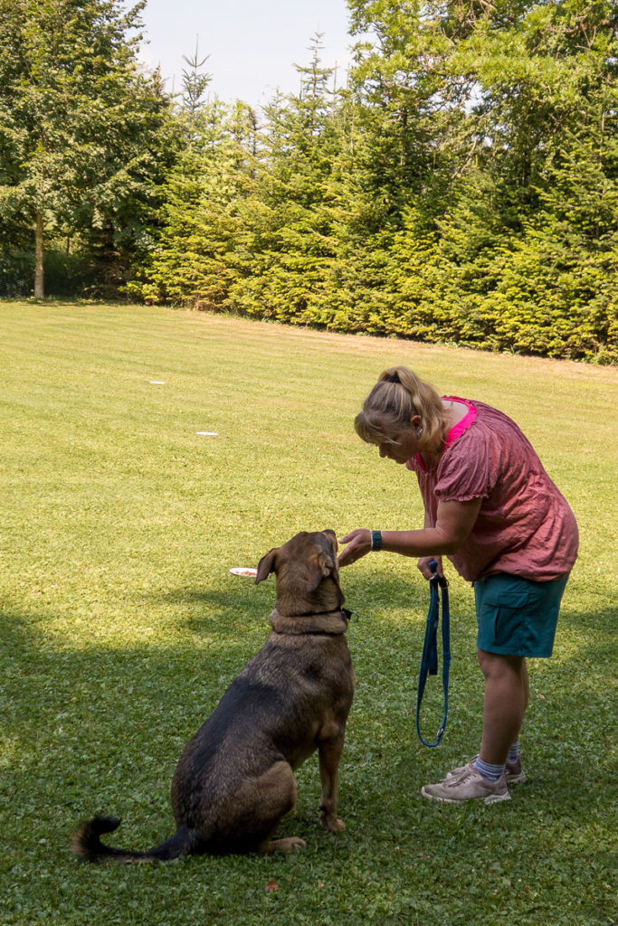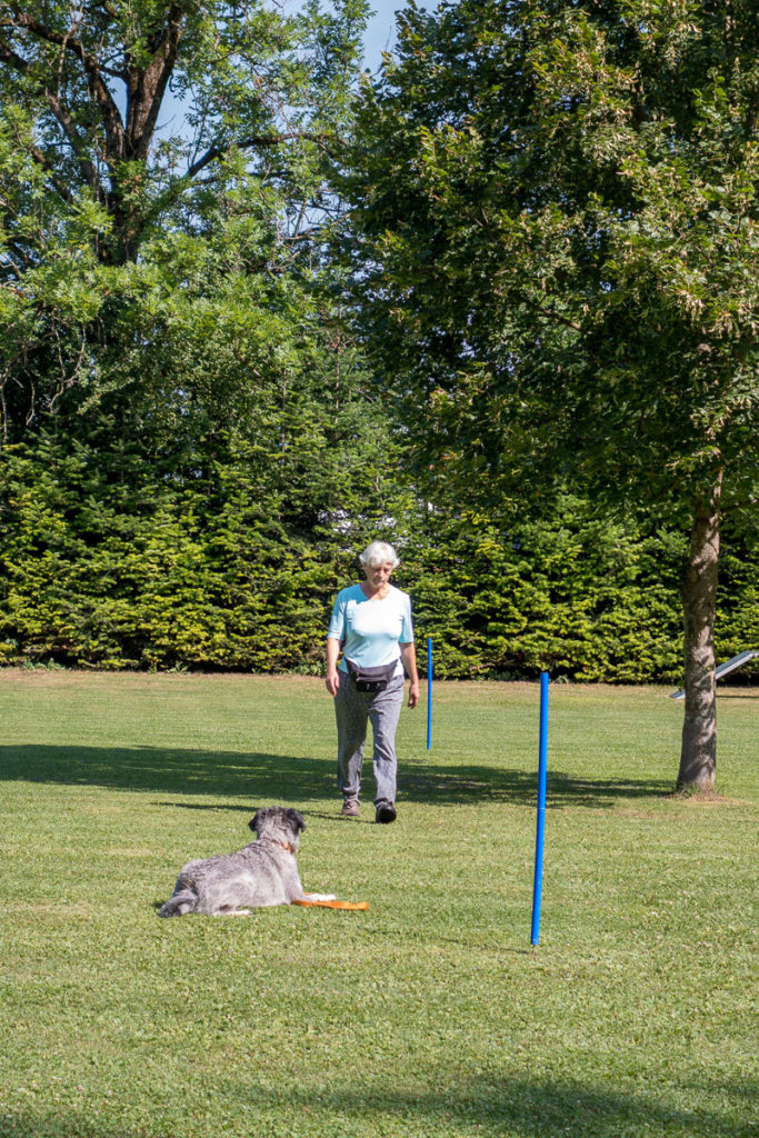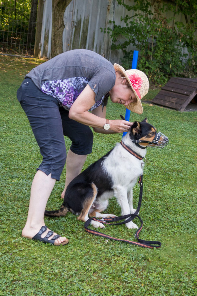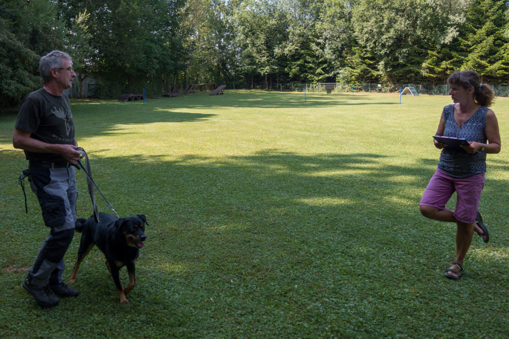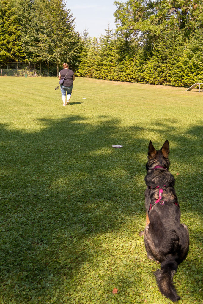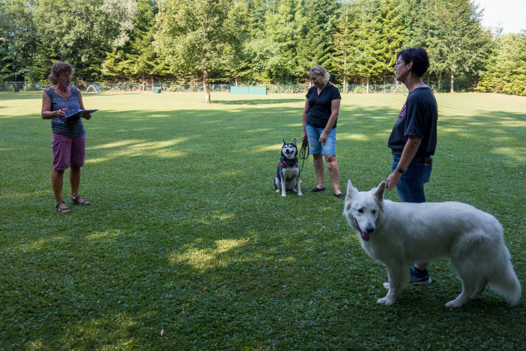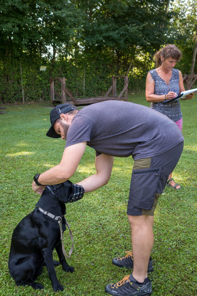 Punkt 9:30 Uhr gings dann auch schon los. Immer zwei Teams wurden auf den Platz gebeten und haben von der Trainerin Gitti die Anweisungen erhalten, die ausgeführt werden mussten. Von einem zuverlässigen Sitz und Platz inkl. Distanz zum Hundehalter, laufen an lockerer Leine, dem Anlegen eines Maulkorbs, auslesen des Chips, dem Abruf unter Ablenkung, dem Lauf durch eine Gruppe von Menschen sowie der Königsdisziplin: dem Impuls zu widerstehen, das leckere Katzenfutter von einem der drei platzierten Teller zu naschen und sich auf den direkten Weg zu Frauchen bzw. Herrchen zu machen.