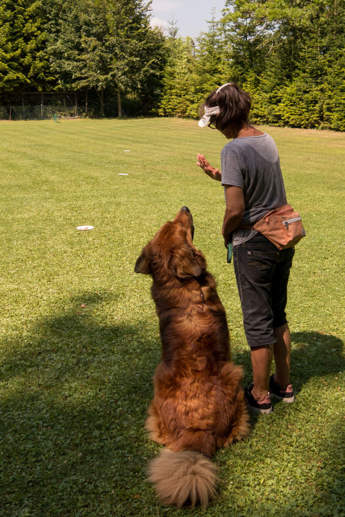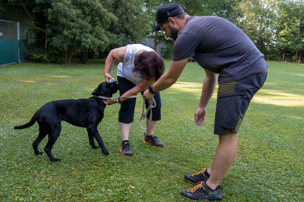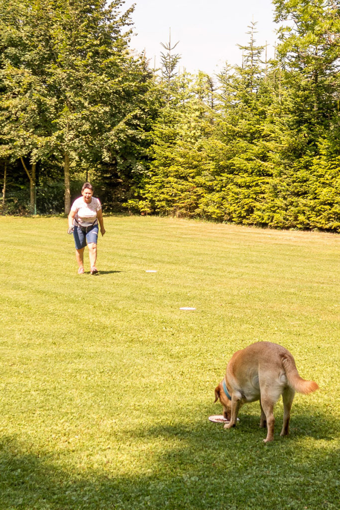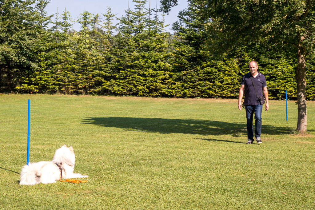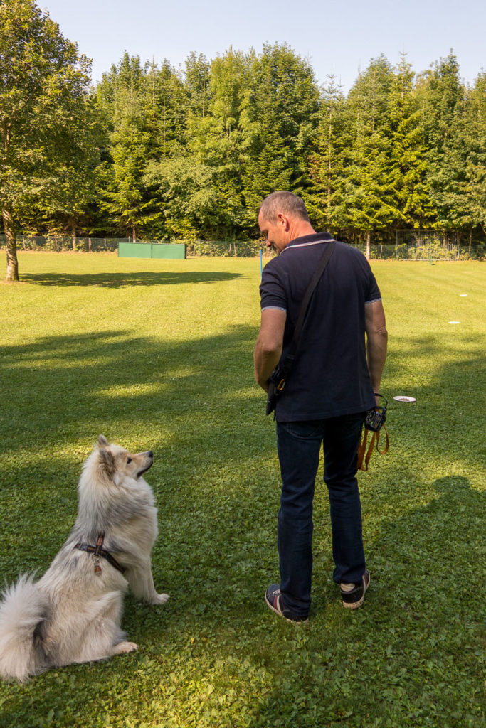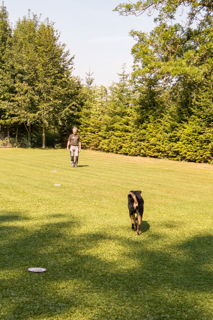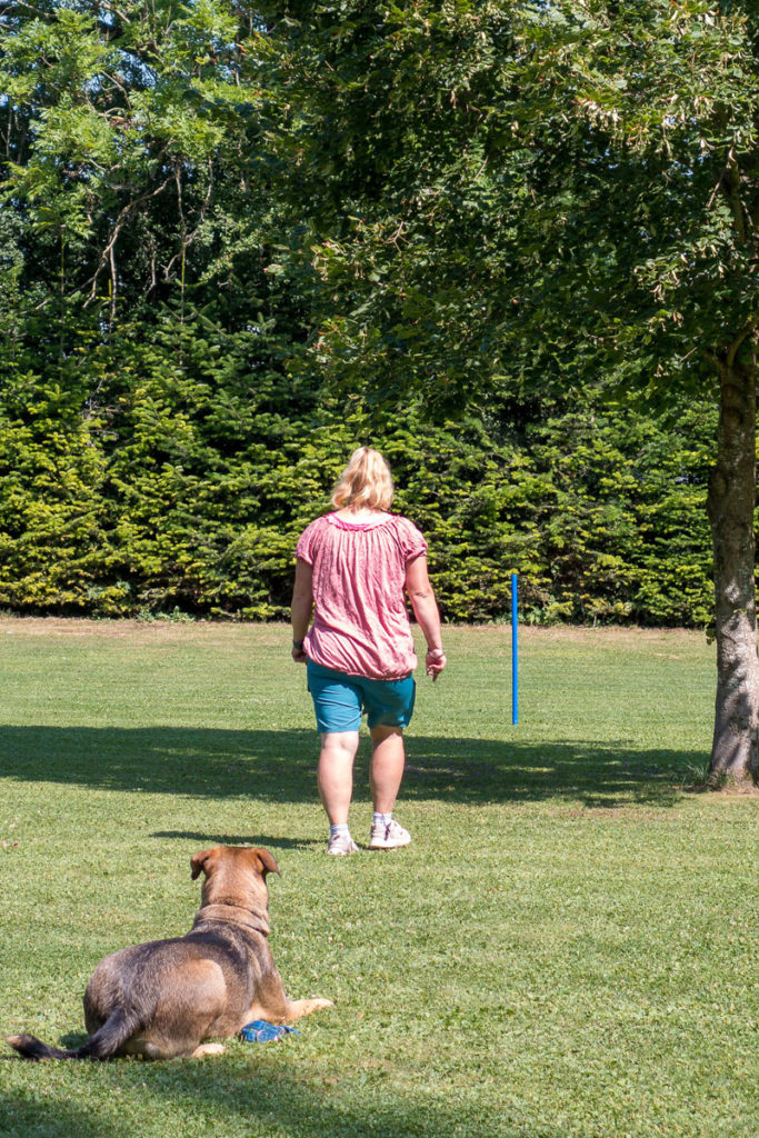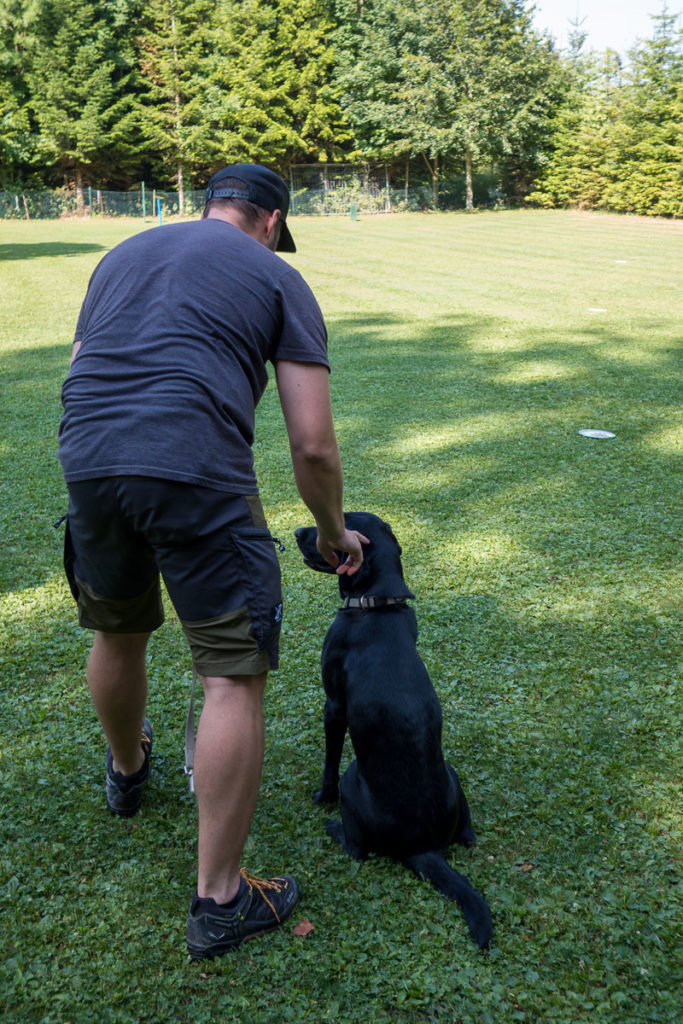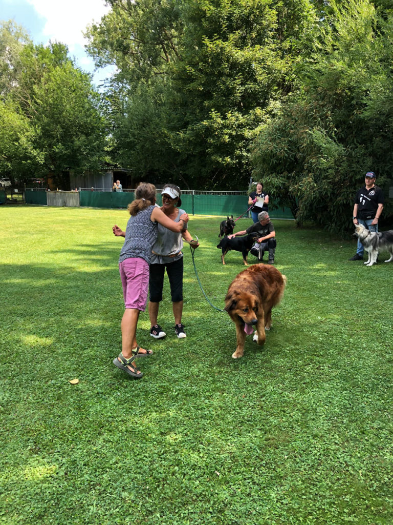 Punkt 9:30 Uhr gings dann auch schon los. Immer zwei Teams wurden auf den Platz gebeten und haben von der Trainerin Gitti die Anweisungen erhalten, die ausgeführt werden mussten. Von einem zuverlässigen Sitz und Platz inkl. Distanz zum Hundehalter, laufen an lockerer Leine, dem Anlegen eines Maulkorbs, auslesen des Chips, dem Abruf unter Ablenkung, dem Lauf durch eine Gruppe von Menschen sowie der Königsdisziplin: dem Impuls zu widerstehen, das leckere Katzenfutter von einem der drei platzierten Teller zu naschen und sich auf den direkten Weg zu Frauchen bzw. Herrchen zu machen.