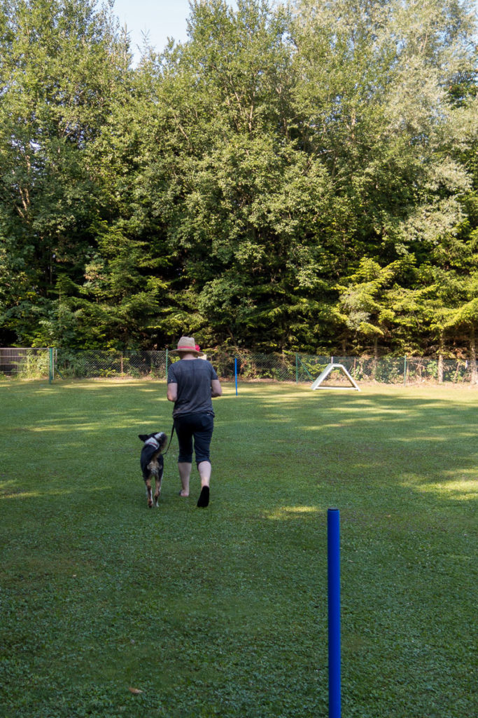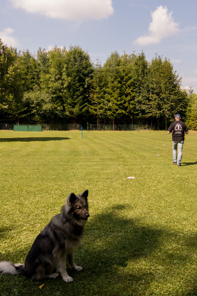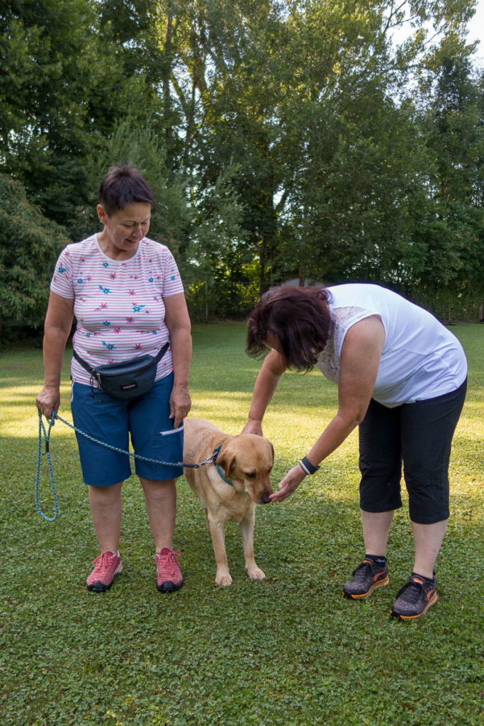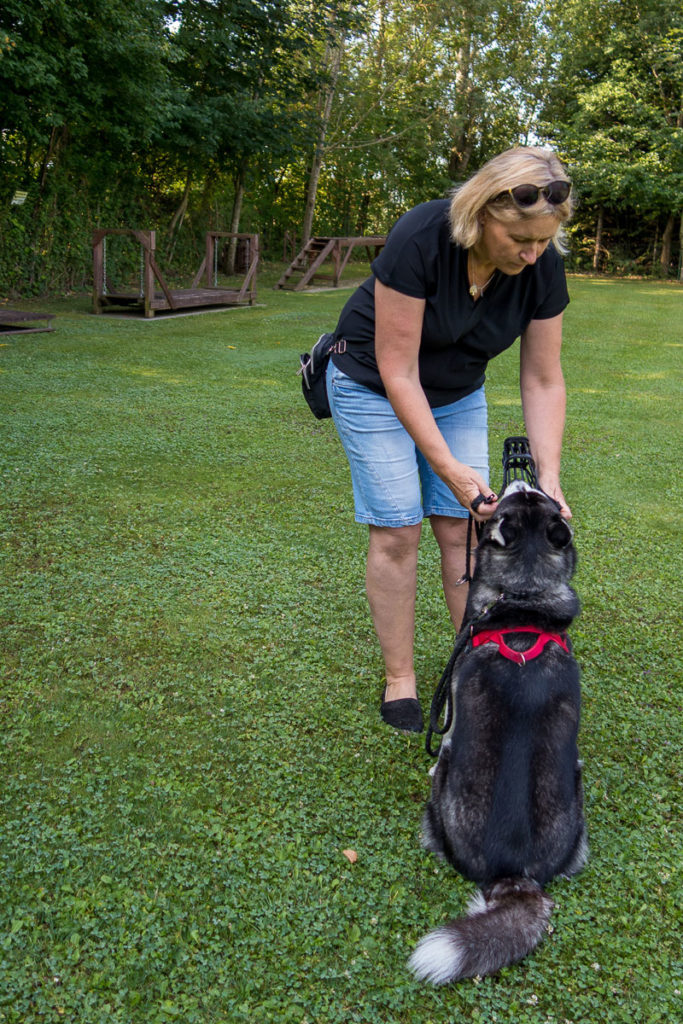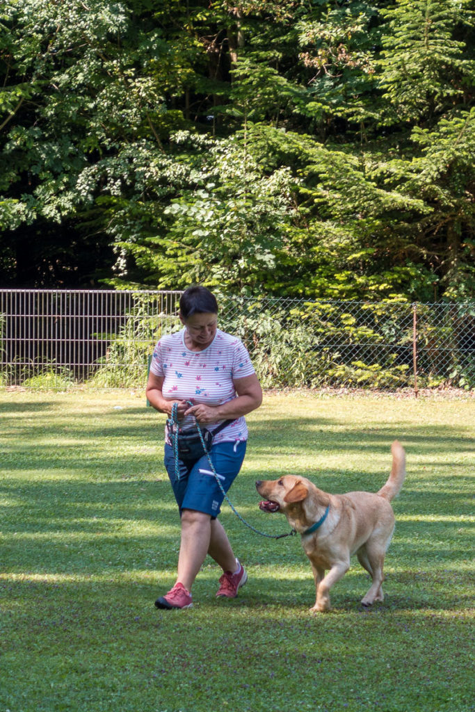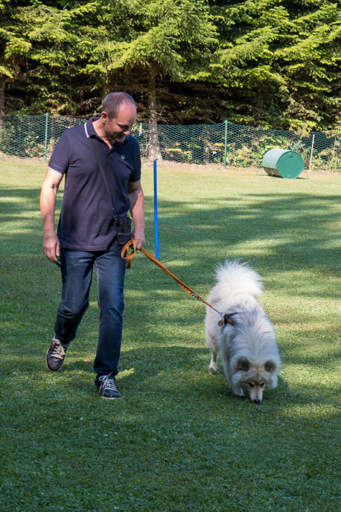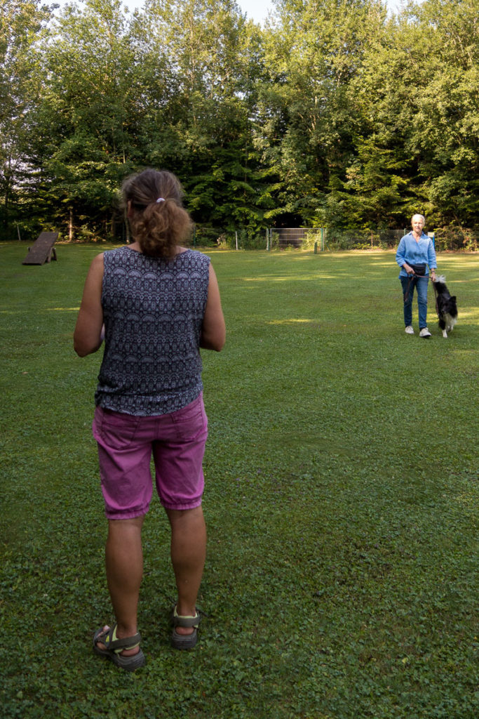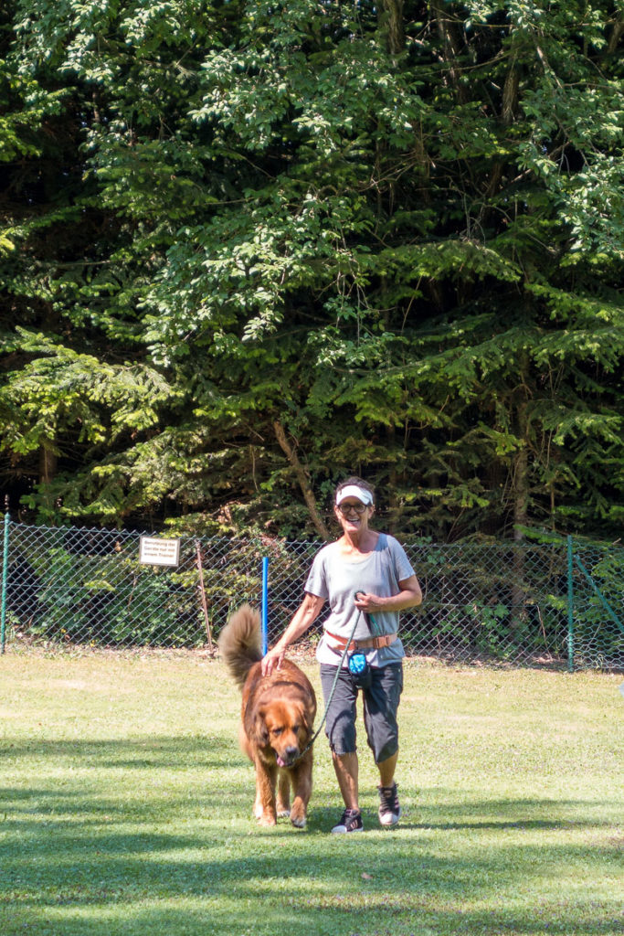 Punkt 9:30 Uhr gings dann auch schon los. Immer zwei Teams wurden auf den Platz gebeten und haben von der Trainerin Gitti die Anweisungen erhalten, die ausgeführt werden mussten. Von einem zuverlässigen Sitz und Platz inkl. Distanz zum Hundehalter, laufen an lockerer Leine, dem Anlegen eines Maulkorbs, auslesen des Chips, dem Abruf unter Ablenkung, dem Lauf durch eine Gruppe von Menschen sowie der Königsdisziplin: dem Impuls zu widerstehen, das leckere Katzenfutter von einem der drei platzierten Teller zu naschen und sich auf den direkten Weg zu Frauchen bzw. Herrchen zu machen.