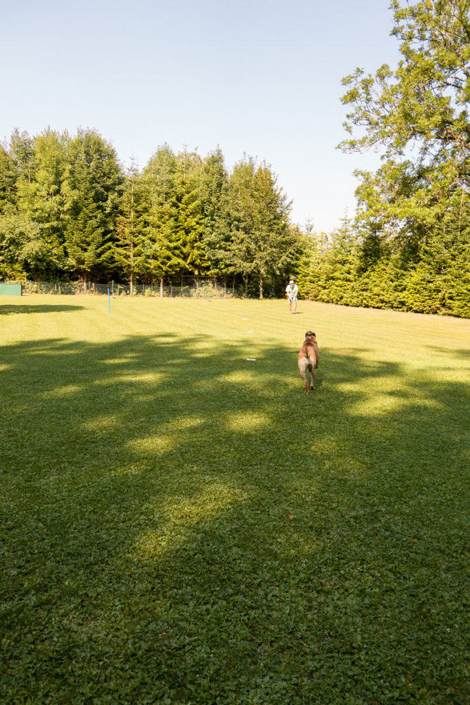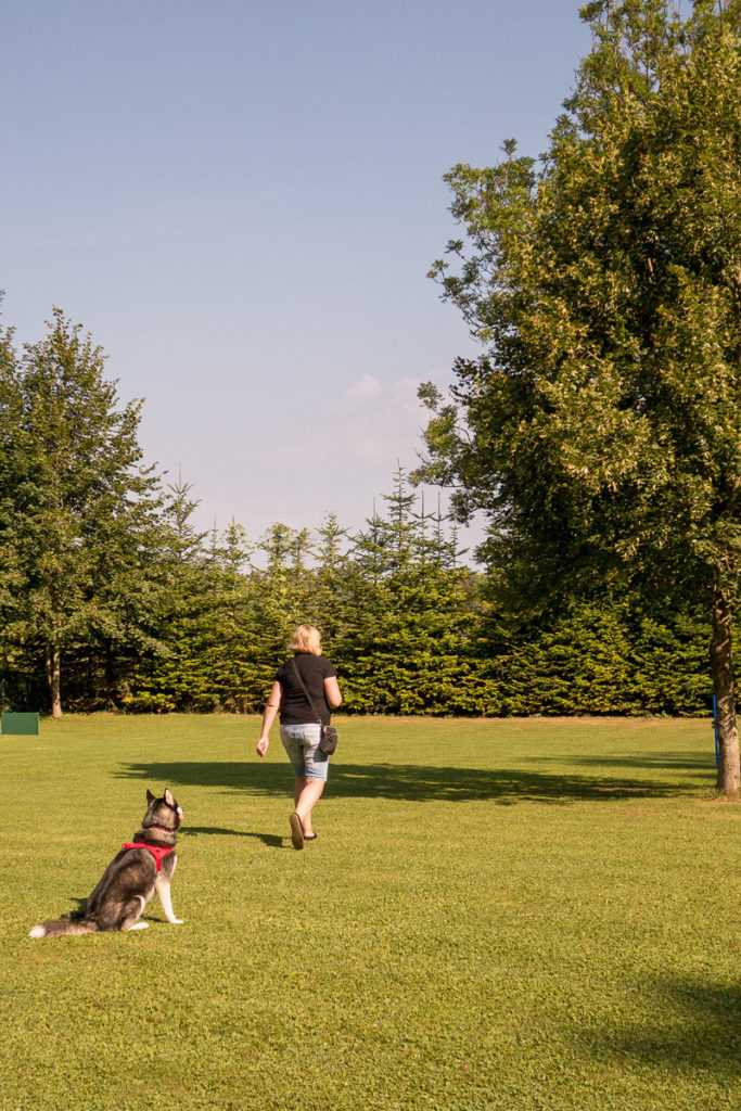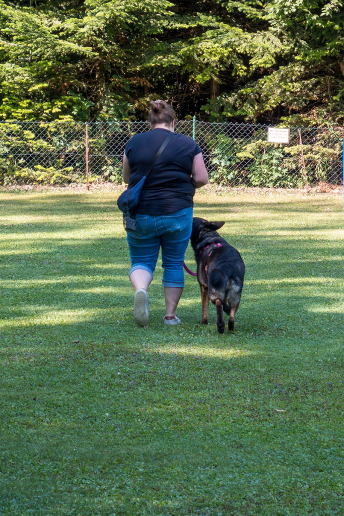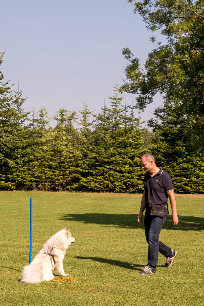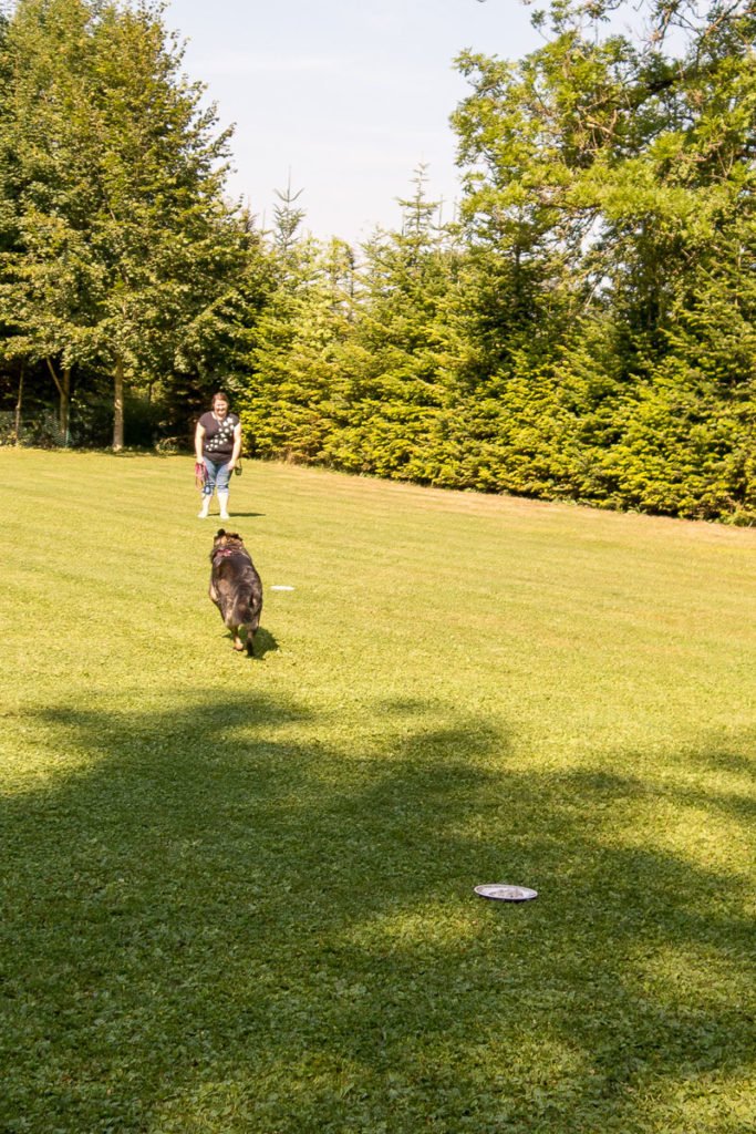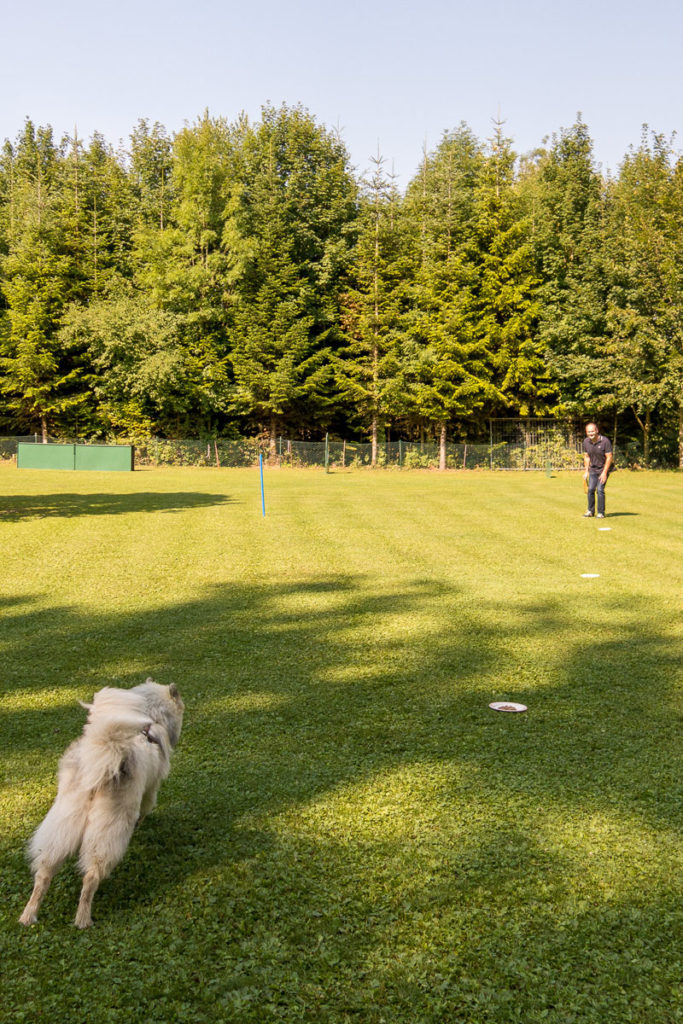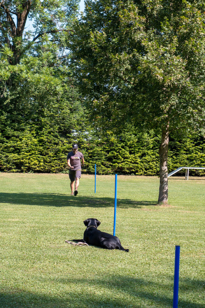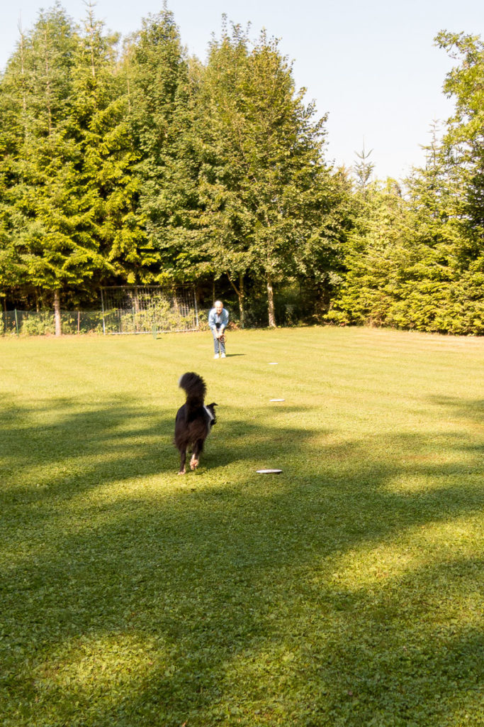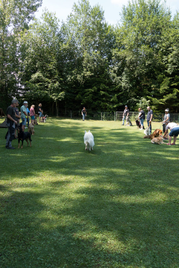 Punkt 9:30 Uhr gings dann auch schon los. Immer zwei Teams wurden auf den Platz gebeten und haben von der Trainerin Gitti die Anweisungen erhalten, die ausgeführt werden mussten. Von einem zuverlässigen Sitz und Platz inkl. Distanz zum Hundehalter, laufen an lockerer Leine, dem Anlegen eines Maulkorbs, auslesen des Chips, dem Abruf unter Ablenkung, dem Lauf durch eine Gruppe von Menschen sowie der Königsdisziplin: dem Impuls zu widerstehen, das leckere Katzenfutter von einem der drei platzierten Teller zu naschen und sich auf den direkten Weg zu Frauchen bzw. Herrchen zu machen.